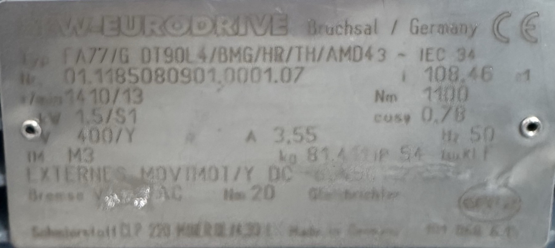 Ο μειωτήρας SEW-EURODRIVE FA77/G με ηλεκτροκινητήρα DT90L4 και ενσωματωμένο φρένο BMG αποτελεί ισχυρή και αξιόπιστη λύση για εφαρμογές που απαιτούν υψηλή ροπή, χαμηλές στροφές και ασφαλή ακινητοποίηση. Με σχέση μετάδοσης i=108,46 αποδίδει 13 στροφές/λεπτό (με 1410rpm είσοδο) και ροπή 1100Nm, καλύπτοντας ιδανικά ανάγκες σε ταινιόδρομους, ανυψωτικά, γερανογέφυρες, αναδευτήρες, μεταφορικά συστήματα και βιομηχανικές γραμμές παραγωγής.
